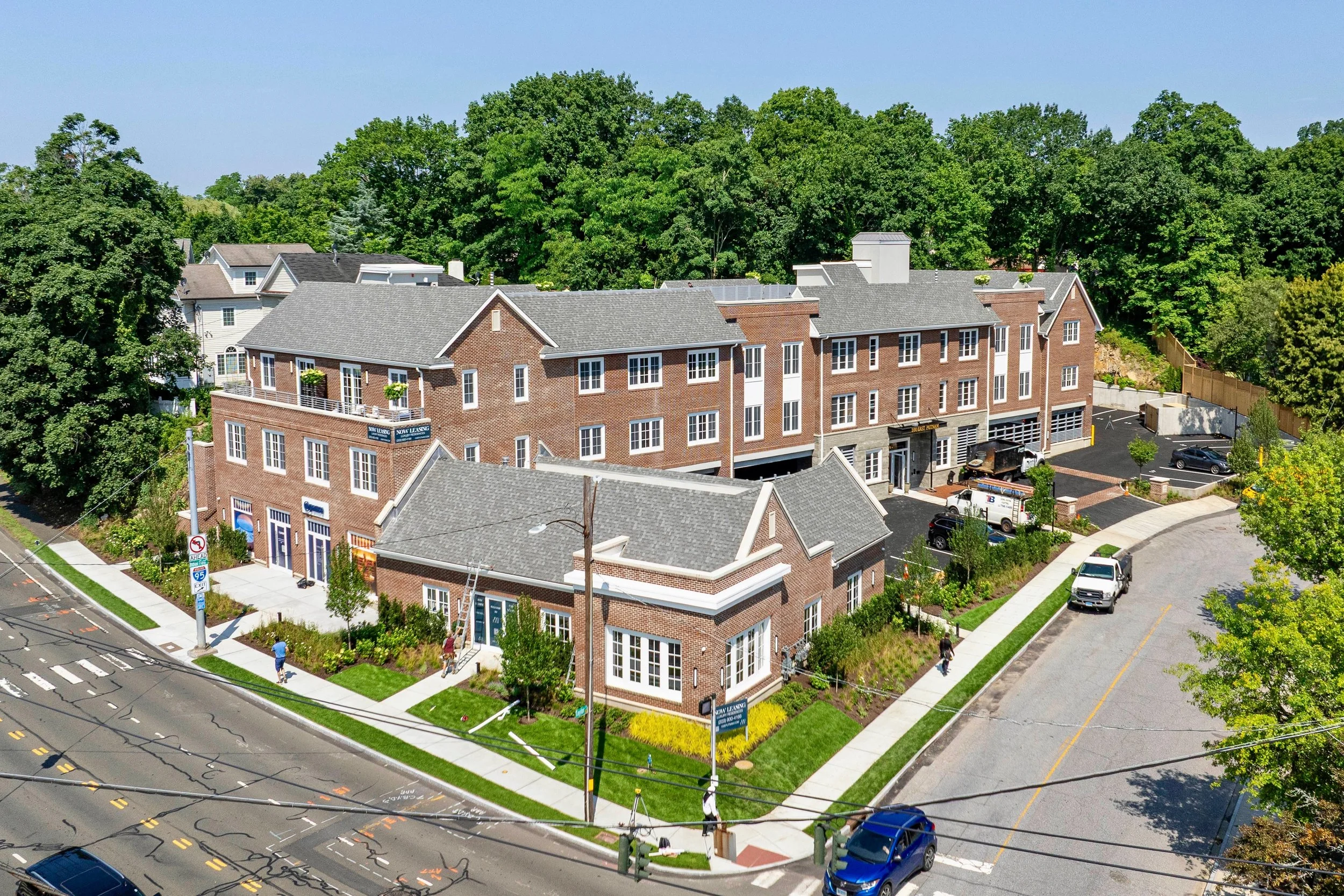 100 East Putnam Avenue is a ground-up 3-story luxury apartment building, located on Route 1 in downtown Cos Cob, CT. It is being built as an “80/20” market/workforce housing project under the Greenwich 6-110 program. There are 2 stories of luxury oversize apartments, built over a ground floor that has 3,500 s.f. of Retail space, covered parking and a tenant lobby. The rooftop is built out as a luxurious amenity space, with grills and seating areas.